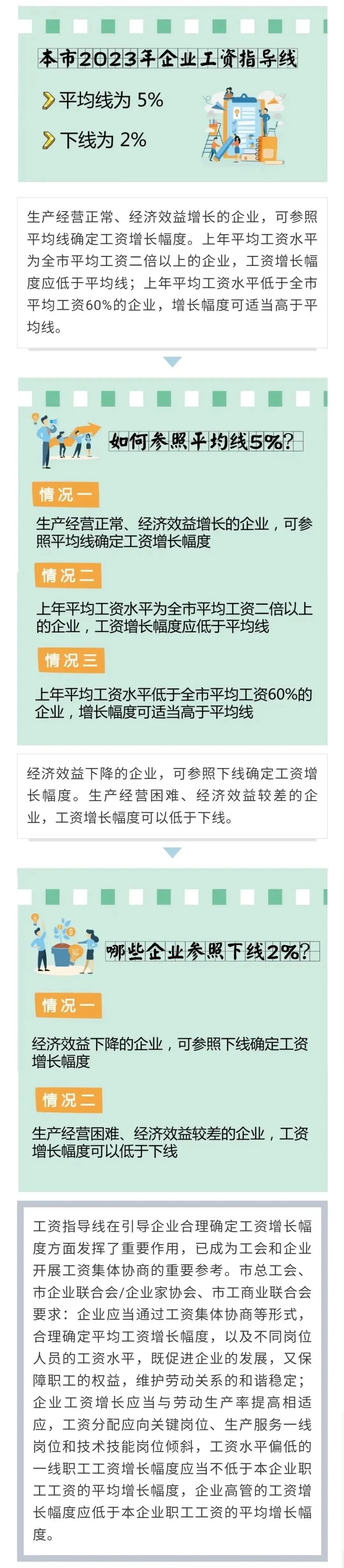 人社局介绍,为引导企业职工工资合理增长,并为企业和职工开展工资集体协商提供依据,经市劳动关系三方共同研究,市总工会、市企业联合会/企业家协会、市工商业联合会联合发布了上海2023年企业工资指导线:平均线为5%,下线为2%。工资指导线有什么作用?如何参照平均线5%?哪些企业参照下线2%?